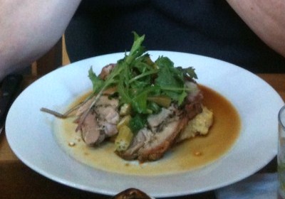 My dish was cochon de lait — suckling pig — served on a bed of grits, corn and okra. The best cochon de lait is seasoned by slitting the uncooked meat and stuffing in a mixture of garlic, parsley and other savory herbs, then roasting on a spit over an open fire. The result should be a crispy, cracklin’-like skin and tender, melt-in-your-mouth meat with delicate flavors. And that is exactly what I got. The skin was crisp and salty, a perfect counterpoint to the succulent, sage-y tenderness of the meat.