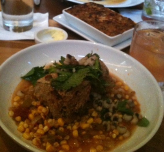 Lisa ordered ham hocks with black-eyed peas and maque choux (sauteed corn, tomato, onions, bell pepper). The ham hocks were dusted in corn flour, roasted and fried. Although they were flavorful, we found them a little on the tough side. Braising would probably have been as kind to the flavor and yet produced a more tender dish. The maque choux was quite good.